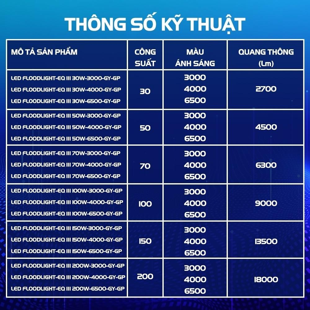 Công suất đa dạng: Đèn có nhiều lựa chọn công suất từ 30W đến 200W, cho phép bạn chọn lựa phù hợp với nhu cầu chiếu sáng của không gian và khu vực cần ánh sáng.