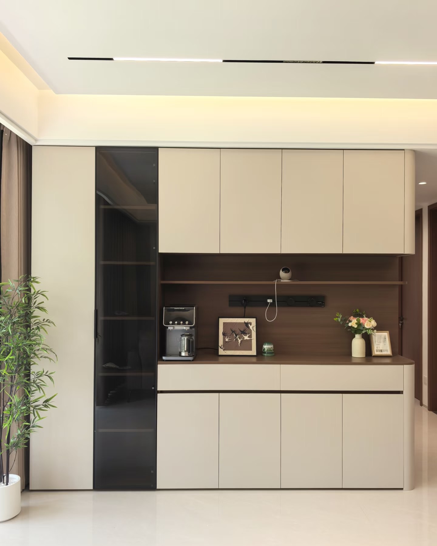 Việc hạn chế sử dụng ổ cắm rời và các dây điện chằng chịt giúp không gian trở nên gọn gàng, ngăn nắp và dễ chịu hơn về mặt thị giác. Thay vì phải bố trí nhiều ổ cắm kéo dài gây rối mắt và tiềm ẩn nguy cơ mất an toàn, hệ thống ổ cắm điện thanh ray được lắp đặt liền mạch, giúp các thiết bị điện được kết nối một cách khoa học và hợp lý. Nhờ đó, tổng thể không gian trở nên tinh tế, hiện đại và sang trọng hơn, đồng thời nâng cao trải nghiệm sinh hoạt hàng ngày cho gia đình.